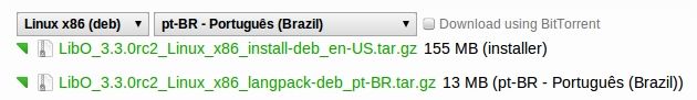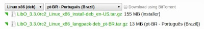 Então, vamos começar!Vá no endereço: http://www.libreoffice.org/download/ e escolha sua plataforma e idioma, respectivamente. No meu caso, baixei os pacotes .deb para uma máquina linux de 32 bits (x86 deb) e selecionei o idioma pt-BR. Veja imagem abaixo: